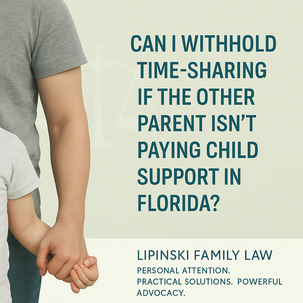 It’s a common and emotional question — but withholding time-sharing in Florida is not allowed under state law. While it might feel like a fair reaction, the courts treat time-sharing and child support as two completely separate legal obligations. In this post, we’ll explain how the law defines each, what happens if support stops, and how to enforce your rights without jeopardizing your parenting plan.